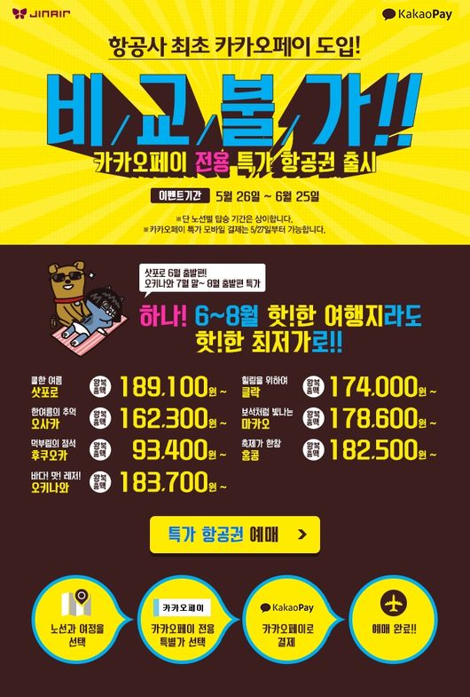 한편 진에어는 이번 카카오페이를 통한 항공권 결제 서비스 런칭에 맞춰 26일부터 6월 25일까지 한달 간 항공권 특가 프로모션과 선물 증정 이벤트를 진행한다.
