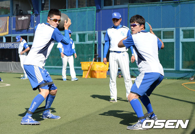 26일 오후 대구 시민운동장야구장에서 열릴 '2015 타이어뱅크 KBO 리그' 삼성과 넥센 히어로즈의 경기에 앞서 삼성 박찬도와 박해민이 훈련을 하고 있다.