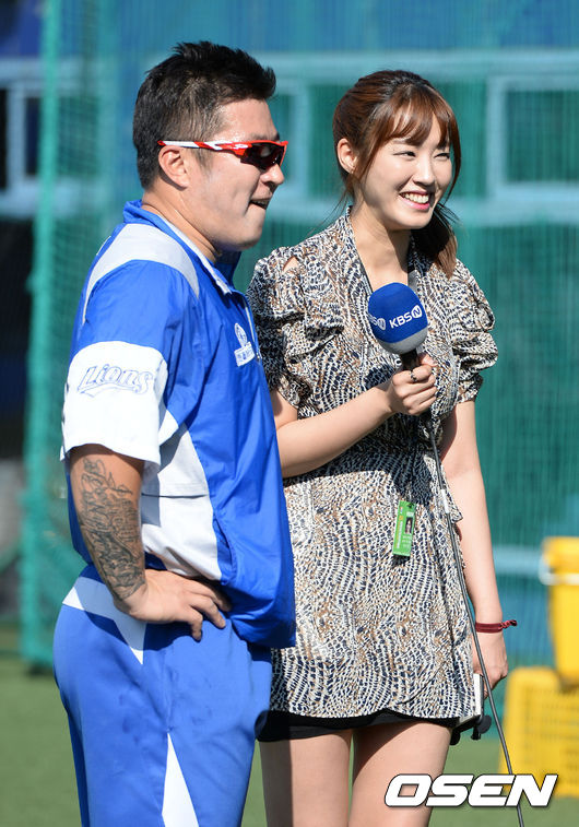 26일 오후 대구 시민운동장야구장에서 열릴 '2015 타이어뱅크 KBO 리그' 삼성과 넥센 히어로즈의 경기에 앞서 삼성 최형우가 정인영 KBS N 아나운서와 인터뷰를 진행하고 있다.