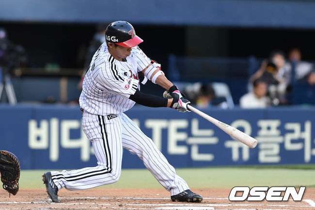 26일 오후 서울 잠실야구장에서 열린 '2015 타이어뱅크 KBO 리그' LG 트윈스와 kt 위즈의 경기, 1회말 무사 주자 3루 LG 황목치승이 1타점 적시타를 치고 있다.