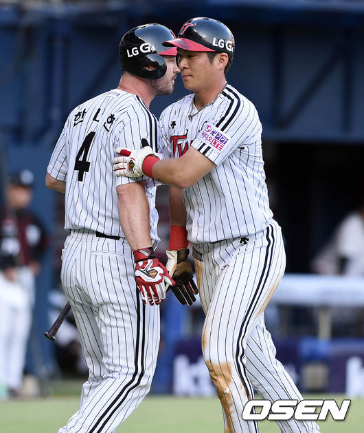 26일 오후 서울 잠실야구장에서 열린 '2015 타이어뱅크 KBO 리그' LG 트윈스와 kt 위즈의 경기, 1회말 무사 주자 3루 3루주자 LG 오지환이 황목치승의 안타에 홈을 밟고 한나한과 기쁨을 나누고 있다.