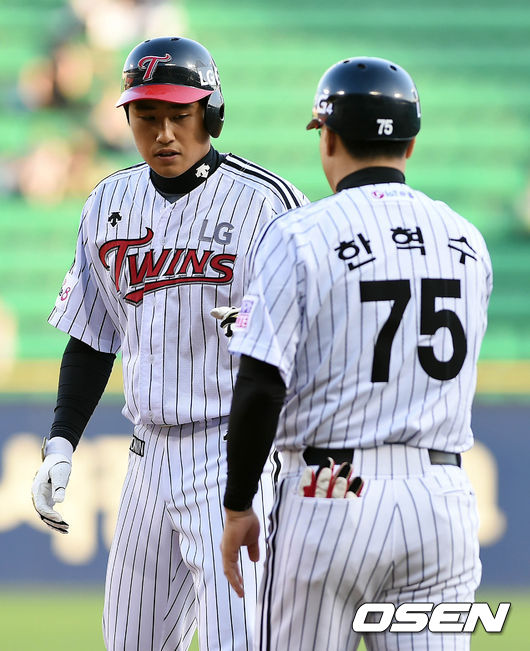 26일 오후 서울 잠실야구장에서 열린 '2015 타이어뱅크 KBO 리그' LG 트윈스와 kt 위즈의 경기, 1회말 2사 주자 3루 LG 채은성이 1타점 적시타를 치고 1루에서 한혁수 코치와 기쁨을 나누고 있다.