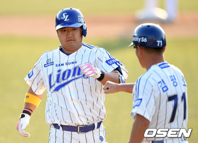 1회말 2사 1,2루에서 삼성 박석민이 좌전 적시타를 치고 김평호 코치와 하이파이브를 하고 있다.