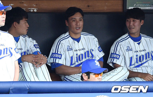 손바닥 통증으로 선발 제외된 삼성 이승엽이 동료들과 더그아웃에서 이야기를 하고 있다.