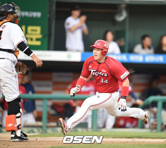 26일 대전 한화생명이글스파크에서 열린 '2015 타이어뱅크 KBO 리그' 한화 이글스와 KIA 타이거즈의 경기,2회초 2사 1,2루 신종길의 적시타때 2루 주자 이홍구 홈에서 득점을 올리고 있다