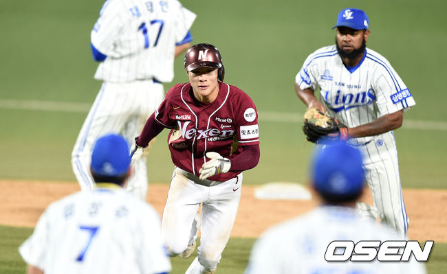 8회초 무사 1루 협살에 걸린 넥센 1루주자 김하성이 태그를 피하고 있다.