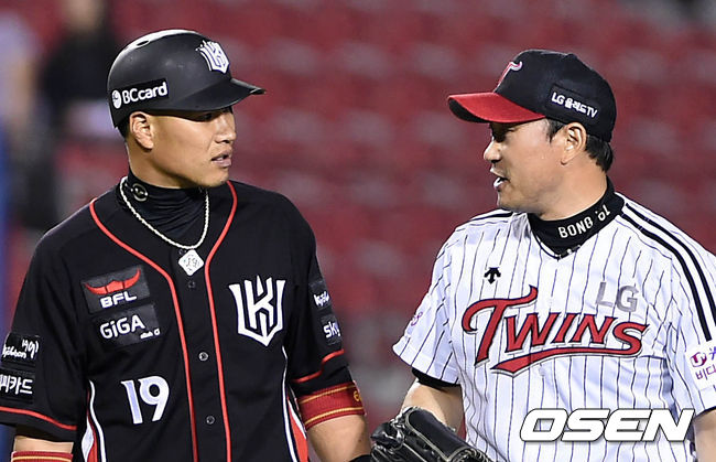 경기종료후 kt 김상현과 LG 봉중근이 이야기를 나누고 있다./greenfield@osen.co.kr