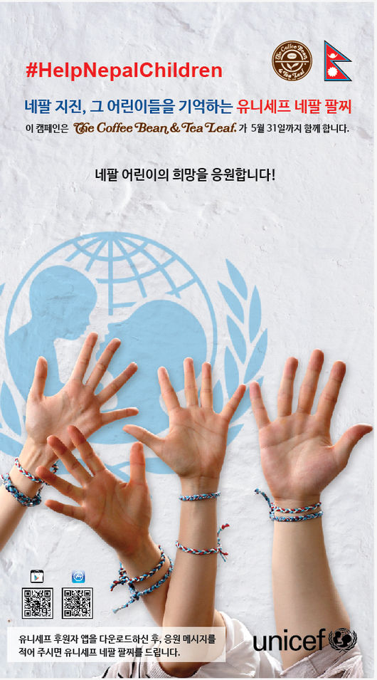 유니세프한국위원회(사무총장 서대원)는 커피빈과 함께 대지진으로 고통 받는 네팔 어린이와 가족들에게 희망과 용기를 전하는 '네팔 팔찌 캠페인'을 진행한다.