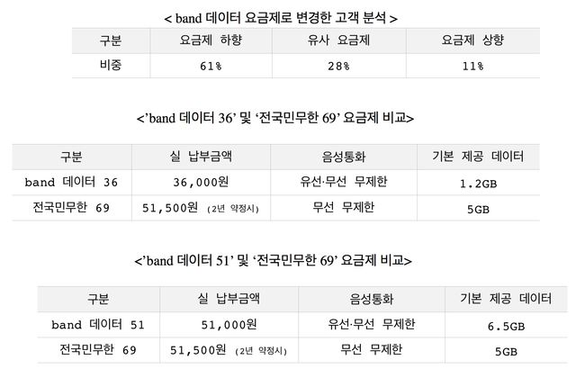‘band 데이터 요금제’ 가입 고객 중 요금제를 하향한 회원비중이 61%, 실질 납부금액이 유사한 요금제를 선택한 비중이 28%, 요금제를 상향한 소비자 비중이 11%로 나타났다.
