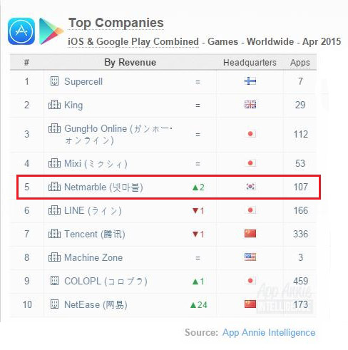 넷마블은 국내 게임사 중 유일하게 10위권 내 이름을 올렸으며, 구글플레이 기록으로는 핀란드 회사 수퍼셀에 이어 전세계 매출 2위를 기록했다.