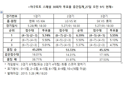 국민체육진흥공단(www.kspo.or.kr)이 발행하는 체육진흥투표권 공식 온라인 발매 사이트 베트맨(www.betman.co.kr)이 28일(목)에 열리는 2015시즌 한국프로야구(KBO) 3경기를 대상으로 한 야구토토 스페셜 30회차 투표율을 중간 집계한 결과, 참가자의 45.32%는 SK-롯데(3경기)전에서 SK가 롯데에 승리할 것이라 예상했다.