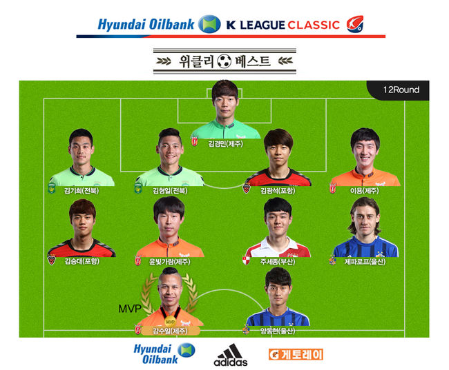 프로축구연맹(이하 연맹)은 27일 지난 주말에 열린 K리그 클래식 12라운드 MVP와 베스트 11, 베스트 팀, 베스트 매치 등을 발표했다. 연맹은 K리그 클래식 12라운드 최고의 스타로 강수일을 선정했다.