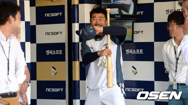 27일 오후 경남 창원 마산야구장에서 열릴 '2015 타이어뱅크 KBO 리그' NC 다이노스와 두산 베어스의 경기에 앞서 NC 이호준이 더그아웃에서 취재진과 이야기를 나누고 있다.