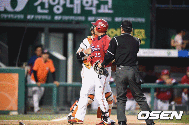 27일 대전 한화생명이글스파크에서 열린 '2015 타이어뱅크 KBO 리그' 한화 이글스와 KIA 타이거즈의 경기, 4회초 2사 1루 이범호가 몸에 맞는 볼로 흥분하자 한화 조인성 포수가 안정을 시키고 있다.