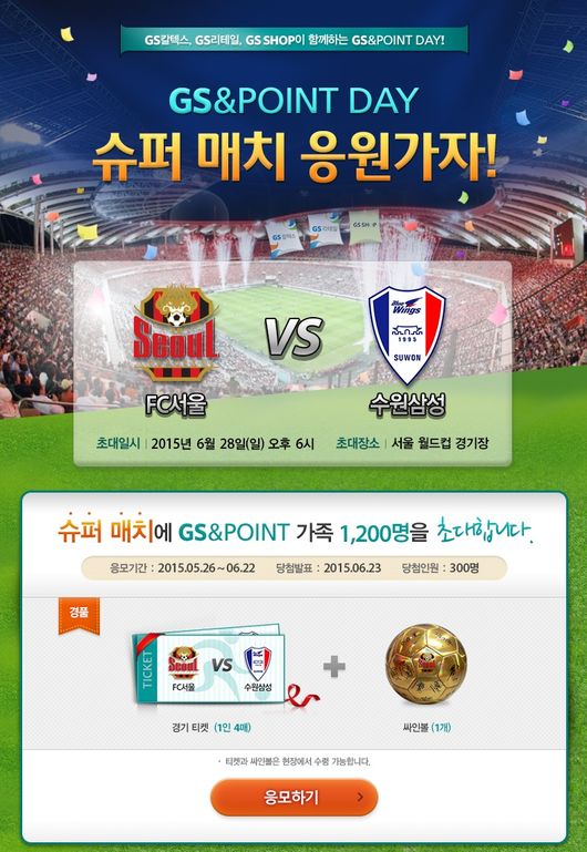 이번 행사는 지금까지 GS&POINT를 이용하고 사랑해주는 회원들의 성원에 보답하기 위해 마련된 행사다. 특별히 K리그 최고의 라이벌전인 FC서울과 수원삼성과의 슈퍼매치 일정에 맞춰 진행, 참가자들에게 잊지 못할 추억을 선사할 예정이다.