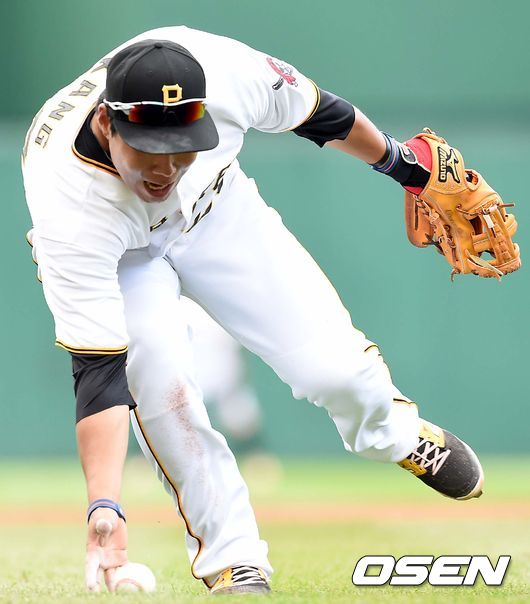 5회초 마이애미 공격 1사 1루 상황 디 고든의 내야 안타 때 피츠버그 3루수 강정호가 맨손 캐캐치를 시도하고 있다. 타자주자 1루에서 세이프./dreamer@osen.co.kr