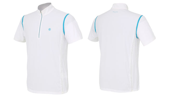 어깨 선 위로 약간 목이 올라오는 하이넥 디자인의 ‘암홀 웰딩 장식 반집업 티셔츠’는 아이스 쿨 기능성 소재인 ‘아쿠아로드’ 원사로 만들어 땀 흡수와 건조기능을 극대화했다.