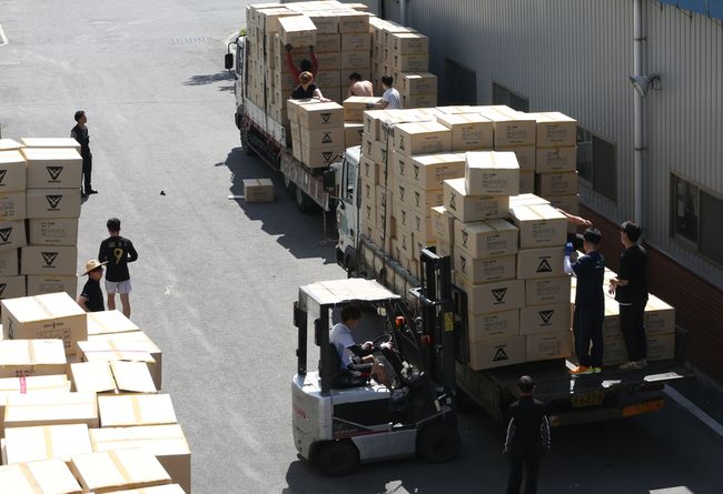 스베누 물류창고에서 임직원들이 운동화를 나르고 있는 모습. /스베누 제공.