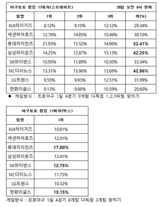 한편, 순위에 상관없이 다득점 3개팀만을 맞히는 ‘박스’ 게임에서는 롯데(17.00%)와 한화(13.15%), SK(12.75%)이 가장 많은 득점을 기록할 것으로 집계됐다.
