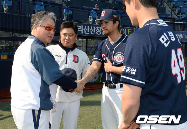 홈팀인 NC 선수단이 먼저 그라운드에서 연습을 하고 있을 때 두산 선수단이 경기장에 도착했고, 김태형 감독이 오재원과 민병헌을 데리고 1루 덕아웃 방향으로 걸어왔다. 그러자 홀로 있던 김경문 감독은 김 감독을 맞이하러 그라운드로 나가며 주장 이종욱과 에릭 해커를 불렀다.