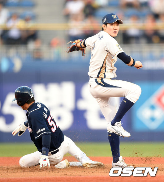 3회초 1사 1루에서 NC 박민우가 두산 정수빈을 병살타로 처리하고 있다.
