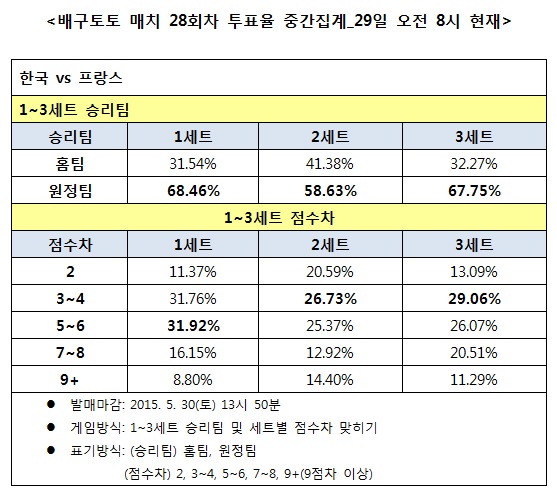 [배구토토] 국민체육진흥공단(www.kspo.or.kr)이 발행하는 체육진흥투표권 수탁사업자인 스포츠토토의 공식 온라인 발매사이트 베트맨(www.betman.co.kr)은 오는 30일 열리는 2015 월드리그 국제남자배구대회 한국-프랑스전을 대상으로 하는 배구토토 매치 28회차 게임 투표율 중간집계 결과, 배구팬들은 원정팀 프랑스가 홈팀 한국을 상대로 1, 2, 3세트 모두 우세한 경기를 펼칠 것으로 예상했다.