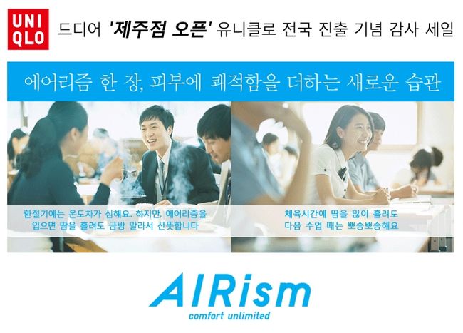 글로벌 SPA 브랜드 유니클로(UNIQLO)는 29일 제주 지역 최초 매장인 ‘유니클로 롯데마트 제주점’이 오픈함에 따라 전국 지역 진출을 기념하며 31일까지 기능성 이너웨어 ‘에어리즘(AIRism) 특별 할인 프로모션’을 전국 매장에서 진행한다. 뿐만 아니라 29일부터 6월 4일까지는 일부 남성, 여성 및 키즈용 제품을 최대 50%까지 대폭 할인하는 특별 할인 프로모션도 진행한다.