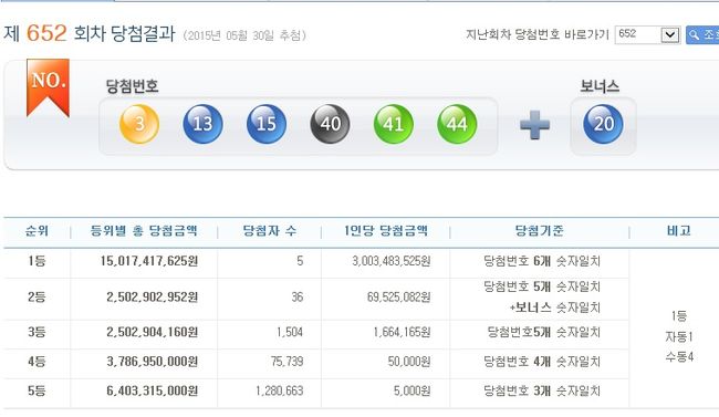 [OSEN=이슈팀] 인생역전의 나눔로또가 5명의 1등 당첨자를 냈다. 나눔로또 제 652회차는 3, 13, 15, 40, 41, 44의 1등 당첨번호를 냈다. 보너스 번호는 20번.