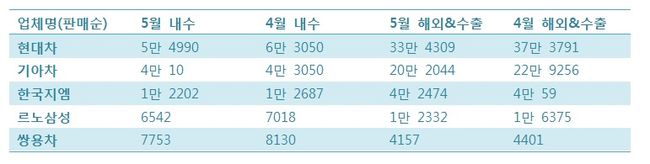 5월 한 달간 국내 완성차 업체들의 내수와 해외 판매 실적이 발표됐다. 쏘렌토와 카니발, 티볼리로 신차 효과를 누린 기아차와 쌍용차를 제외한 세 곳은 모두 전년 동월 대비 내수 판매가 감소했다. 하지만 전월인 4월과 비교해서는 5곳 모두 내수 판매가 부진했던 것으로 나타났다.