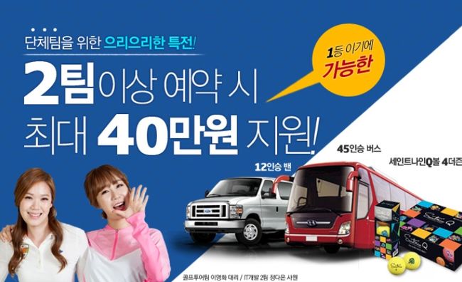 또 용평+버치힐, 메이플비치, 샌드파인, 파인밸리, 블랙밸리 등 강원권 5곳과 화순, 승주, 고창, JNJ골프리조트, 영광 등 전라권 5곳 및 롯데스카이힐 성주 경상권 골프장 3팀(12인) 이상 예약 시 세인트나인Q볼 4더즌 또는 12인승 포드밴(렌트비 20만 원)을 제공하며, 6팀(24인) 이상 예약 시 세인트나인볼Q 8더즌 또는 12인승 포드밴(렌트비 20만 원) 또는 45인승 버스(렌트비 40만 원) 중 원하는 혜택을 선택하여 이용할 수 있다.