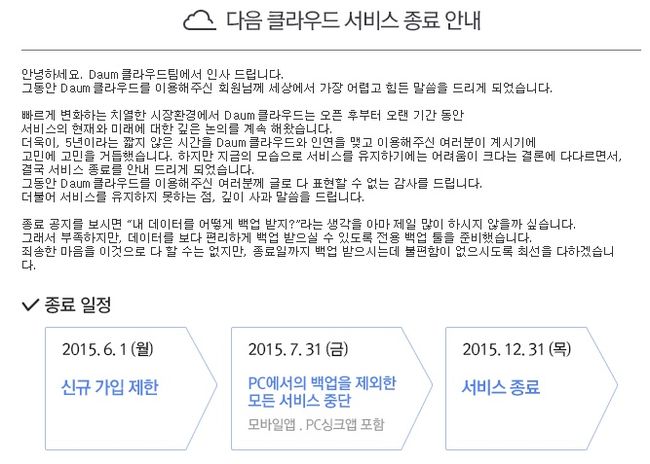 ‘다음 클라우드’는 6월 1일부터 신규 가입이 제한 되며 7월 31일부터는 PC에서의 백업을 제외한 모든 서비스가 중단 된다.