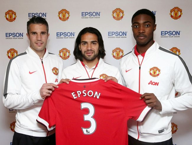 왼쪽부터 로빈 판 페르시, 라다멜 팔카오, 타일러 블랙킷 등 세이코 엡손과의 계약 체결 기념 유니폼을 든 맨체스터 유나이티드 선수. /세이코 엡손 제공.