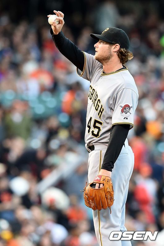 1회말 샌프란시스코 공격 1사 2, 3루 상황 브랜든 벨트에게 2타점 적시 2루타를 허용한 피츠버그 선발 게릿 콜이 아쉬워하며 공을 넘겨 받고 있다.