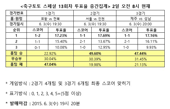 2015시즌 K리그 클래식 3경기 대상 축구토토 스페셜 13회차 투표율 중간집계 결과