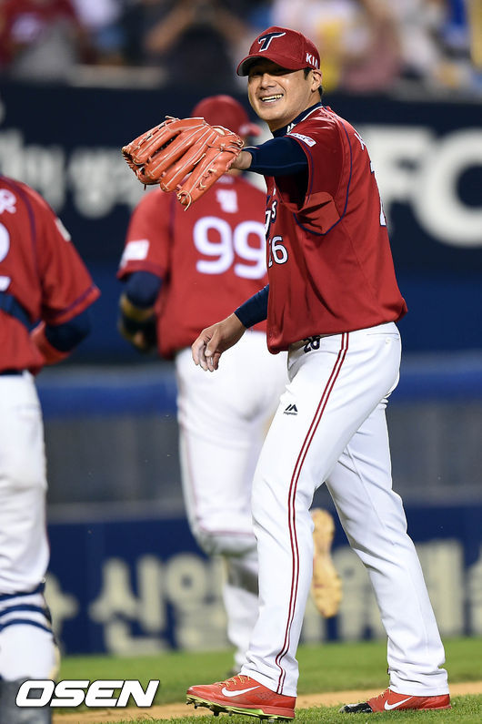 2일 오후 서울 잠실야구장에서 열린 '2015 타이어뱅크 KBO 리그' 두산 베어스와 KIA 타이거즈의 경기, 7회말 이닝종료후 KIA 선발 투수 서재응이 이성우를 향해 미소 짓고 있다.