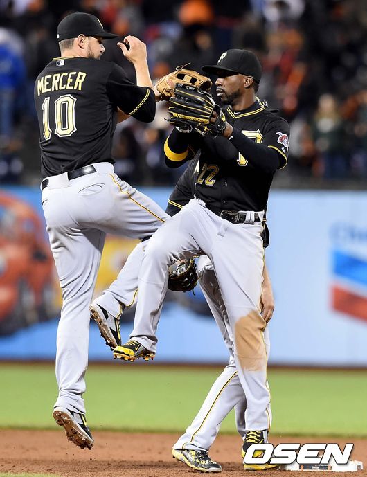 경기 종료 후 피츠버그 앤드류 맥커친과 조디 머서를 비롯한 선수들이 승리의 세리머니를 펼치고 있다./dreamer@osen.co.kr