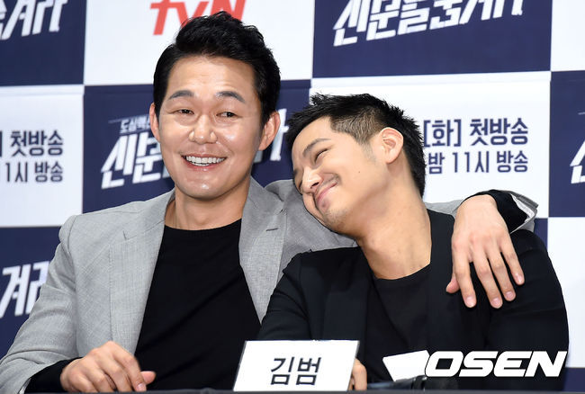 박성웅과 김범이 장난을 치고 있다.
