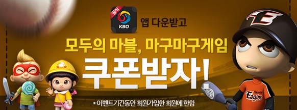 이벤트 기간(6.4~6.17) 동안 KBO 공식 앱을 다운받고 회원가입을 하면 ‘모두의 마블 for Kakao’ 를 비롯해 ‘마구마구 2015 for Kakao’, ‘마구마구2 for Kakao’, ‘레전드 나인 for Kakao’ 등의 인기 모바일 게임 4종 중 1종의 게임 아이템을 선착순으로 증정한다.
