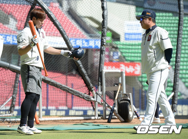 3일 오후 서울 잠실야구장에서 열린 '2015 타이어뱅크 KBO 리그' 두산 베어스와 KIA 타이거즈의 경기,경기시작전 두산 민병헌이 김태형 감독과 이야기를 나누고 있다.
