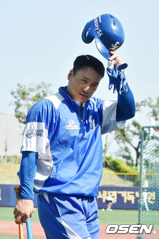 3일 오후 경상북도 포항시 남구 포항야구장에서 '2015 타이어뱅크 KBO 리그' 롯데 자이언츠와 삼성 라이온스의 경기가 열릴 예정인 가운데 삼성 이승엽이 타격훈련을 마치고 취재진쪽을 향해 인사하고 있다.