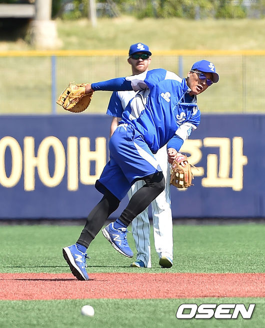 3일 오후 경상북도 포항시 남구 포항야구장에서 '2015 타이어뱅크 KBO 리그' 롯데 자이언츠와 삼성 라이온스의 경기가 열릴 예정인 가운데 삼성 이승엽이 유격수 수비훈련을 하고 있다.