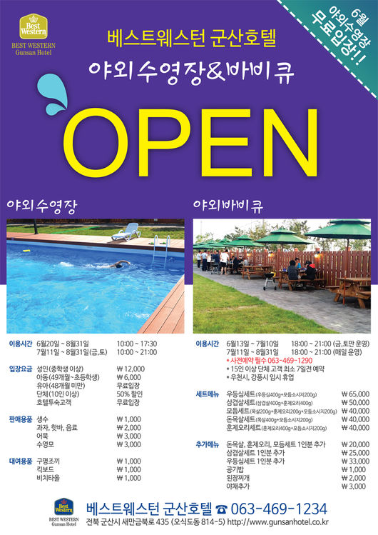 무더워진 날씨에 시원하게 즐길 수 있는 여름 휴가지를 계획 중인 이들을 위해 오는 20일 베스트웨스턴 군산호텔 야외 수영장&바비큐가 오픈을 앞두고 있다. 야외 수영장 입장료는 성인기준 1만 2000원, 어린이 6000원, 유아 무료입장이며 10인 이상 단체는 50% 할인된 가격에, 호텔 투숙객은 수영장 무료로 이용이 가능하다.
