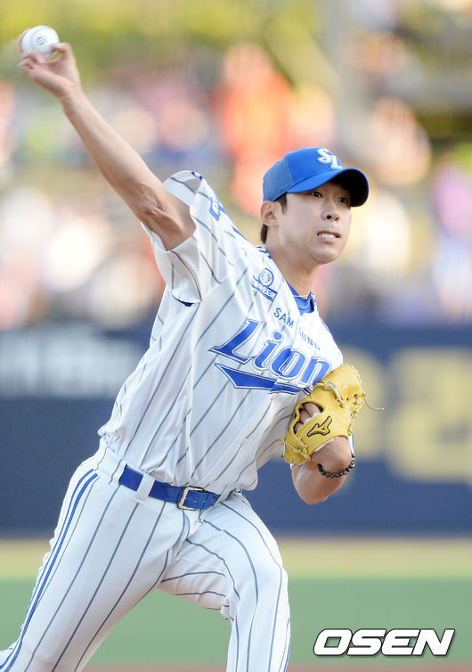 3일 오후 경상북도 포항시 남구 포항야구장에서 열린 '2015 타이어뱅크 KBO 리그' 롯데 자이언츠와 삼성 라이온스의 경기, 삼성 선발 윤성환이 힘차게 공을 뿌리고 있다.
