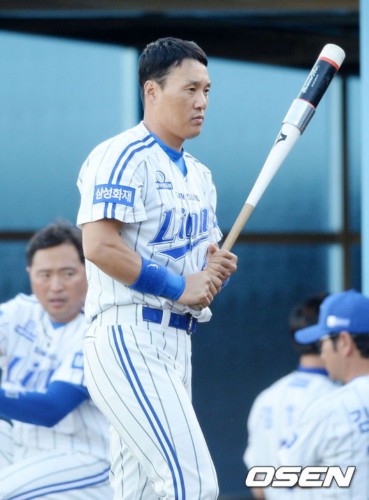 3일 오후 경상북도 포항시 남구 포항야구장에서 열린 '2015 타이어뱅크 KBO 리그' 롯데 자이언츠와 삼성 라이온스의 경기, 삼성 이승엽이 덕아웃 앞에서 배트를 들고 몸을 풀고 있다.