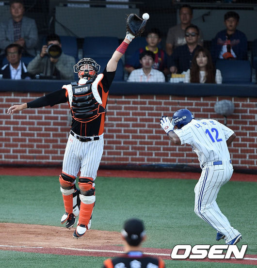 3일 오후 경북 포항시 포항야구장에서 열린 '2015 타이어뱅크 KBO 리그' 삼성 라이온즈와 롯데 자이언츠의 경기 1회말 무사 1,2루 채태인의 1타점 적시타 상황, 강민호가 높은 홈송구 공을 못 잡고 있다. 2루주자 나바로 득점.
