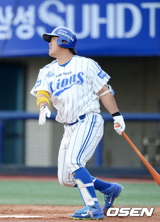 3일 오후 경상북도 포항시 남구 포항야구장에서 열린 '2015 타이어뱅크 KBO 리그' 롯데 자이언츠와 삼성 라이온스의 경기, 1회말 무사 주자 1,2루 삼성 박석민이 중월 스리런 홈런을 날리고 있다.