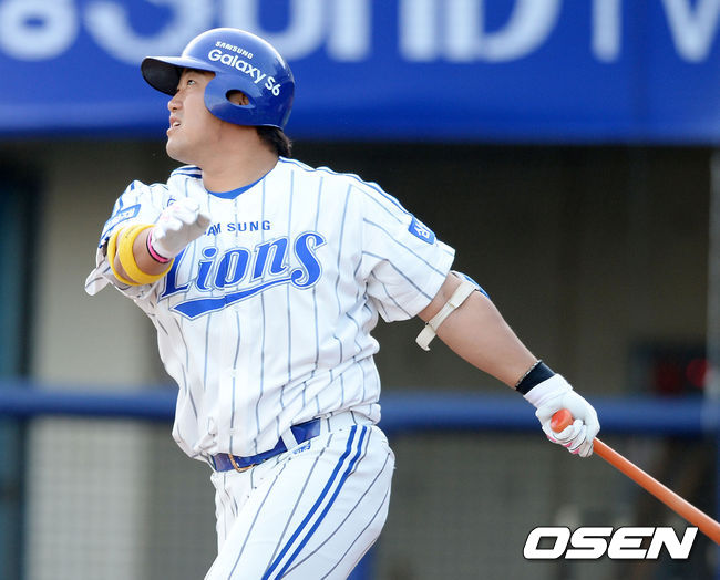 3일 오후 경상북도 포항시 남구 포항야구장에서 열린 '2015 타이어뱅크 KBO 리그' 롯데 자이언츠와 삼성 라이온스의 경기, 1회말 무사 주자 1,2루 삼성 박석민이 중월 스리런 홈런을 날리고 있다.