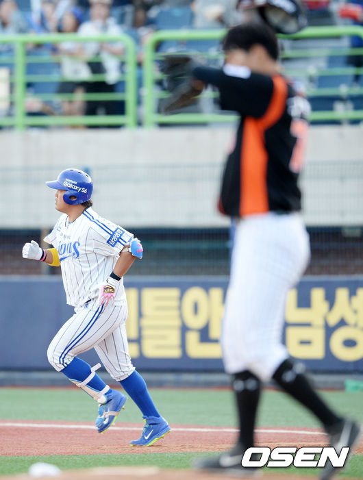 3일 오후 경상북도 포항시 남구 포항야구장에서 열린 '2015 타이어뱅크 KBO 리그' 롯데 자이언츠와 삼성 라이온스의 경기, 1회말 무사 주자 1,2루 삼성 박석민이 중월 스리런 홈런을 날린 후 그라운드를 돌고 있다.
