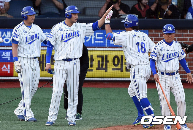 3일 오후 경북 포항시 포항야구장에서 열린 '2015 타이어뱅크 KBO 리그' 삼성 라이온즈와 롯데 자이언츠의 경기 1회말 1사 1,2루 박석민이 스리런홈런을 치고 채태인과 하이파이브를 하고 있다.