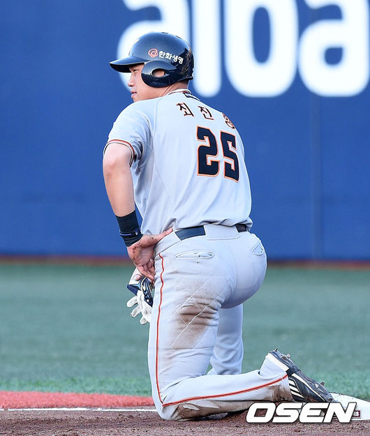 1회초 2사 1,2루에서 한화 1루주자 최진행이 견제사 아웃으로 물러나며 아쉬워하고 있다.